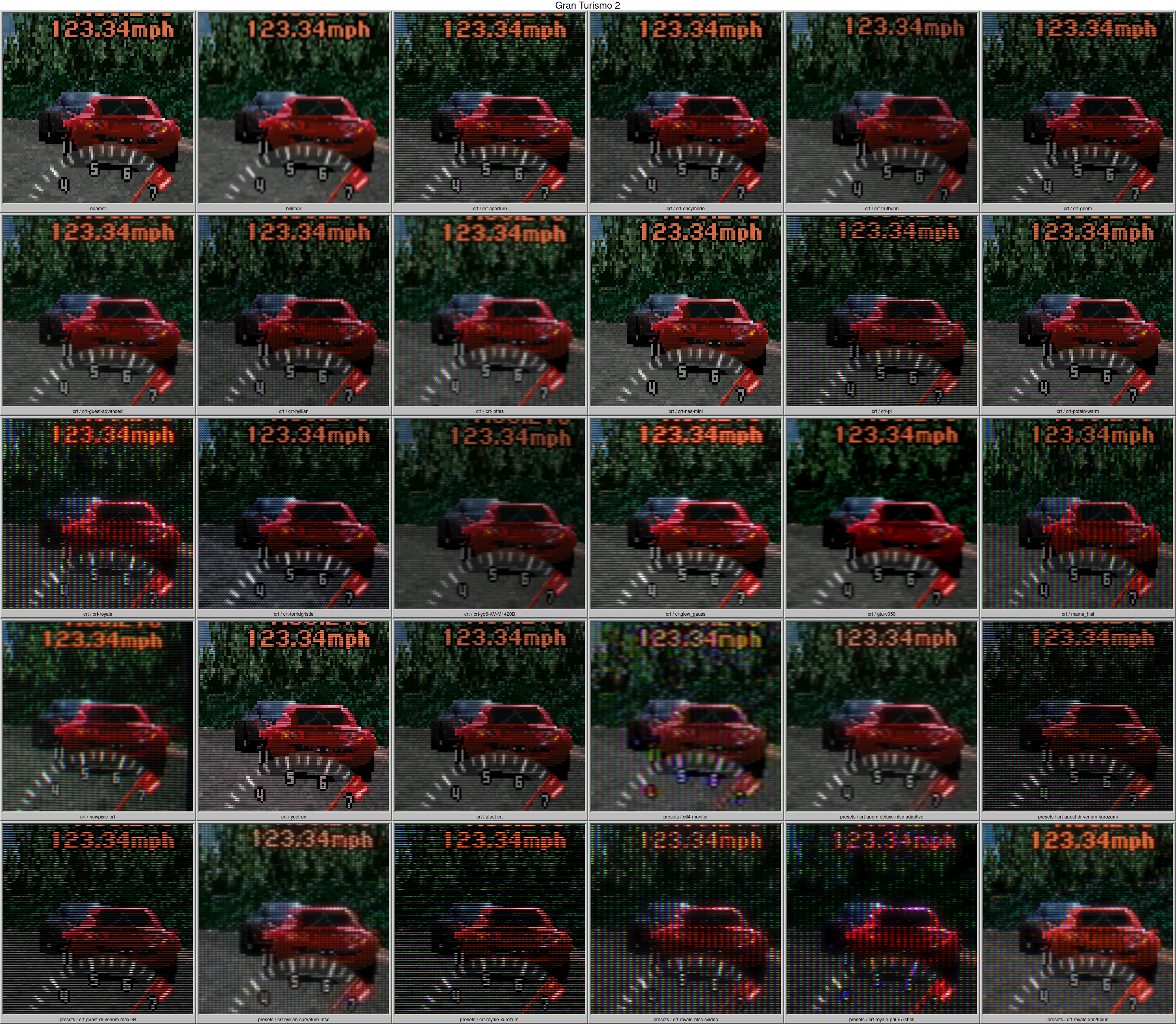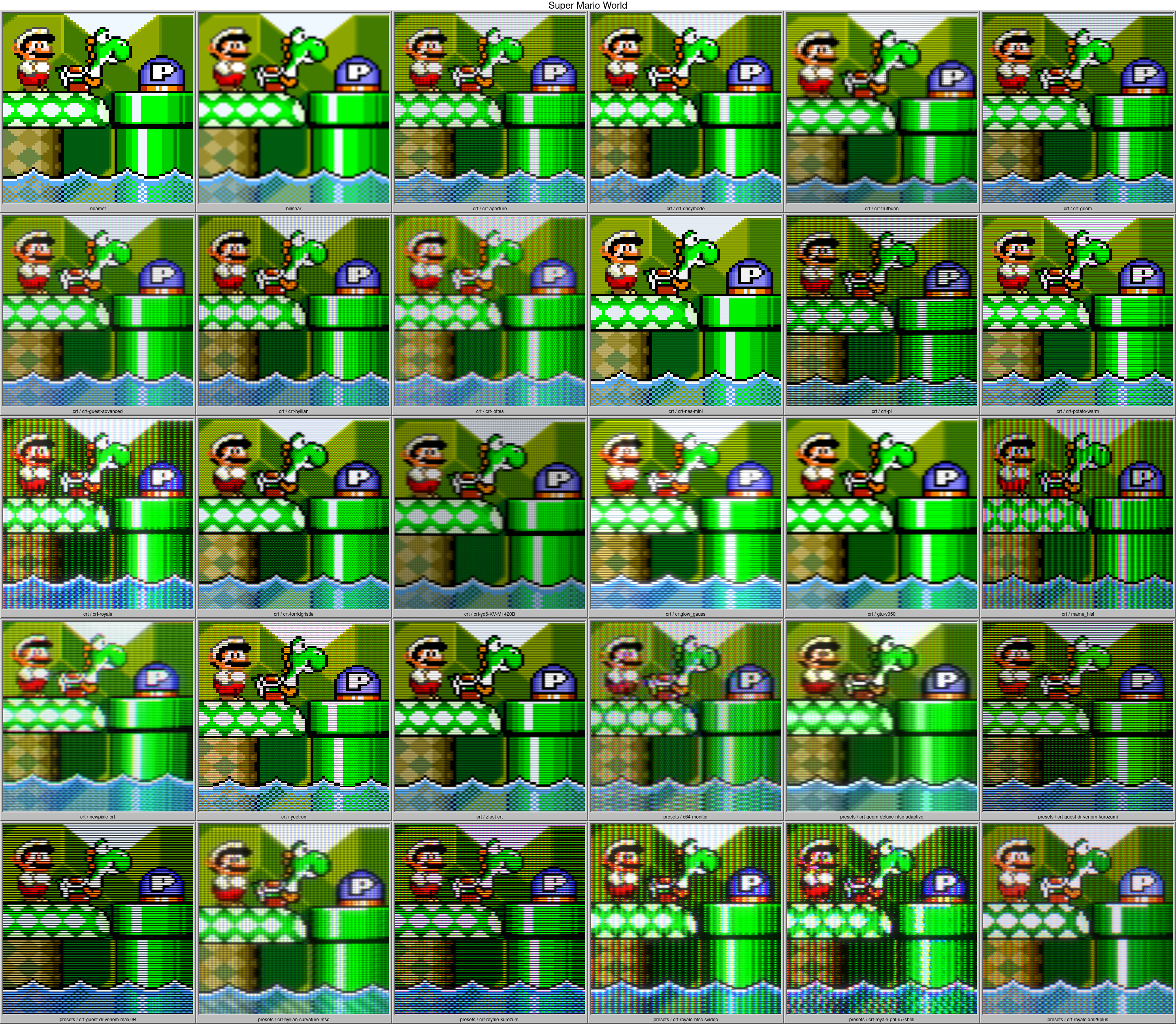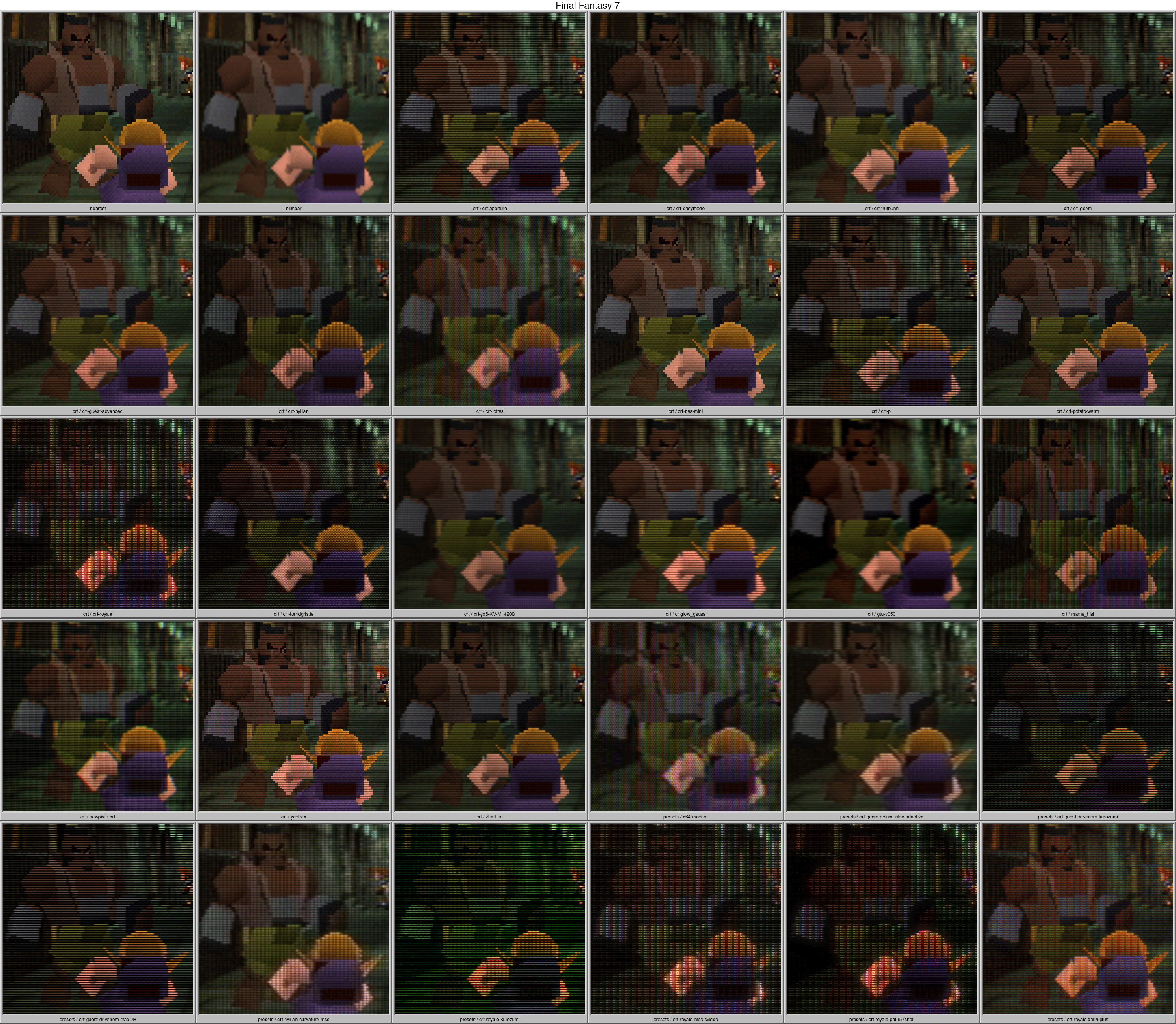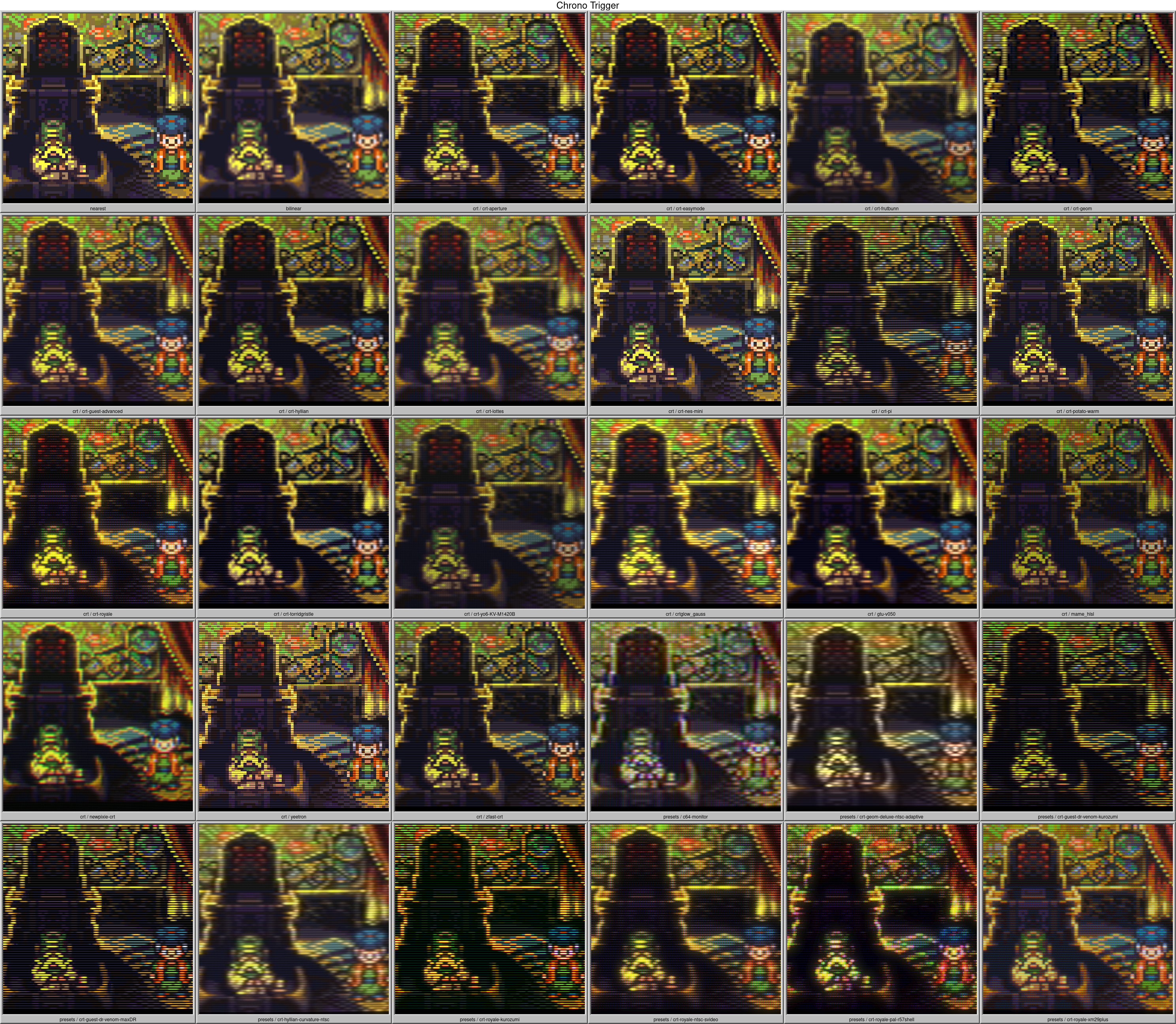 Nearest and Bilinear filtering aren’t actually CRT Shaders, but are included as a reference. I got most of the description from Libretro Docs: Shaders, Libretro Docs: CRT Royale, Emulation General Wiki: CRT shaders and Hunter K’s Filthy Pants Blog: More CRT Shaders.